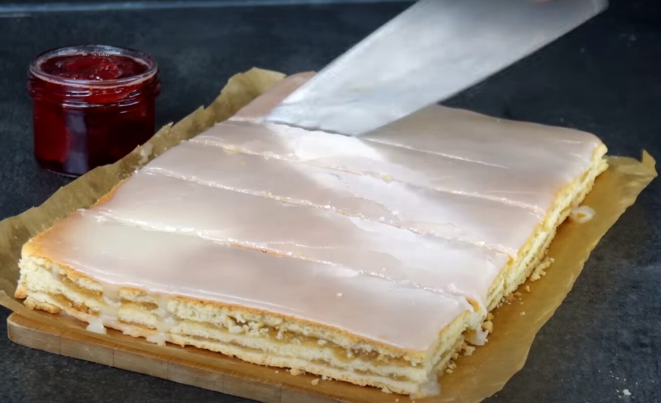 . Glajui sumaišykite cukraus pudrą ir citrinų sultis. Užbaigto pyrago kraštus apipjaustykite ir viršų aptepkite glajumi.