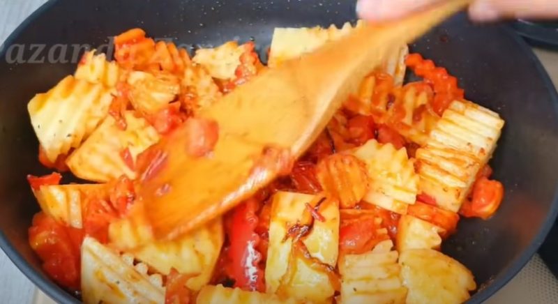 Padažui kepame svogūnų kubelius, tada sudedame tarkuotas morkas, saldžiųjų pipirų kubelius, pomidorų pastą, pomidorų pastą, gabalėlius, išdėliojame bulvių griežinėlius, išmaišome.