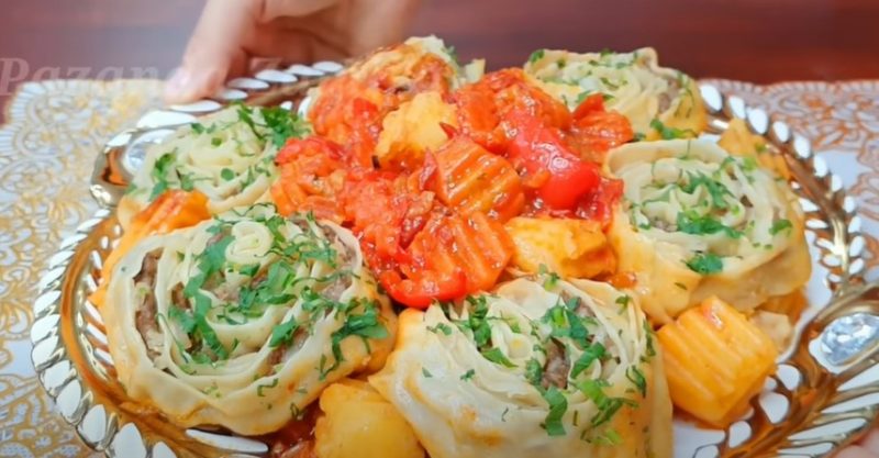 Apetitas ir širdingi pietūs ar vakarienė, kurią sudaro dideli koldūnai ir daržovių padažas. Viskas pasirodo labai skanu iš įprasto produktų rinkinio.