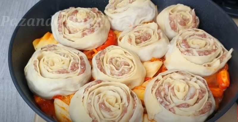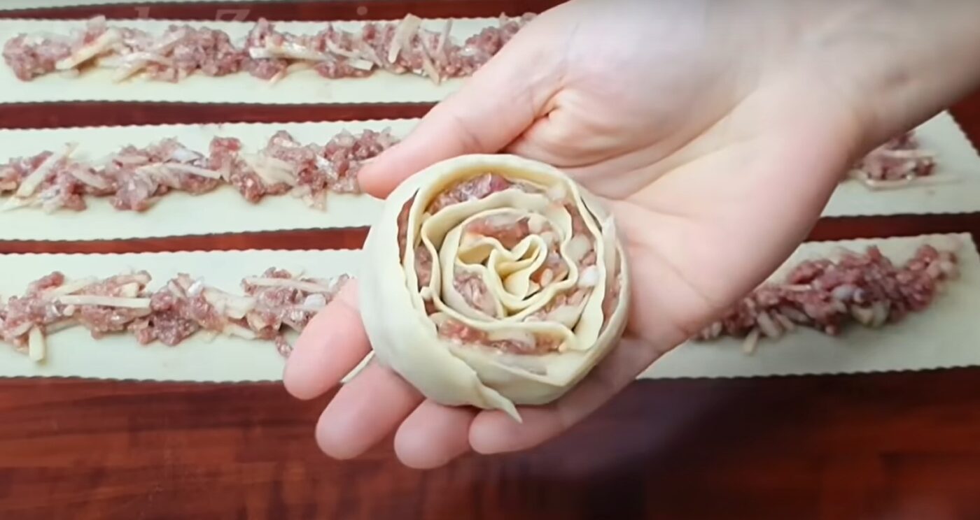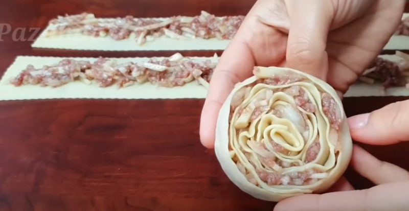 Padėkite žemę ant maltos mėsos juostelių, sulenkite du kartus ir sulenkite sraiges. Palikite juos aukštyn.
