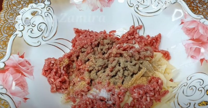 Norėdami užpildyti smulkiai supjaustytus svogūnus, tarkuotas bulves ir maltą mėsą, užpildykite druską, pipirus, prieskonius ir augalinį aliejų, sumaišykite masę iki homogeniškumo.