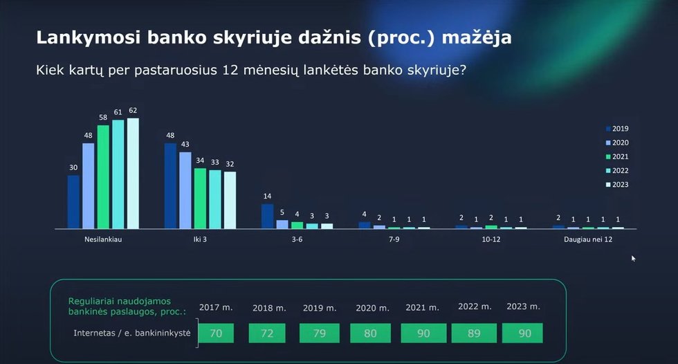 <…> Pernai 62 proc. gyventojų atsakė, kad nė karto nesilankė per metus banko skyriuje. Lygiai tokias pačias tendencijas matome, žiūrėdami į tai, kaip gyventojai naudojasi bankinėmis paslaugomis internetu, el. bankininkyste. Tai per 5 metus skaičius paaugo nuo 70 iki 90 proc. gyventojų. Skyrių taip pat atitinkamai mažėja, kadangi krinta jų lankomumas. Tai yra pagrindinė priežastis“, – paaiškino E. Čepkutė.
