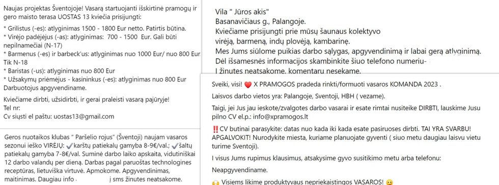 Lietuvos kurortuose įsibėgėjo sezoninių darbuotojų paieška – restoranai, kavinės, viešbučiai, pramogų centrai intensyviai ieško komandų papildymo. Anot jų, aktyviausi kandidatai yra nepilnamečiai moksleiviai, o suaugusieji dirbti nebenori. Šiuo metu pajūryje siūlomos algos svyruoja nuo minimumo iki 1,8 tūkst. eurų į rankas. Darbuotojai viliojami ir papildomomis naudomis.