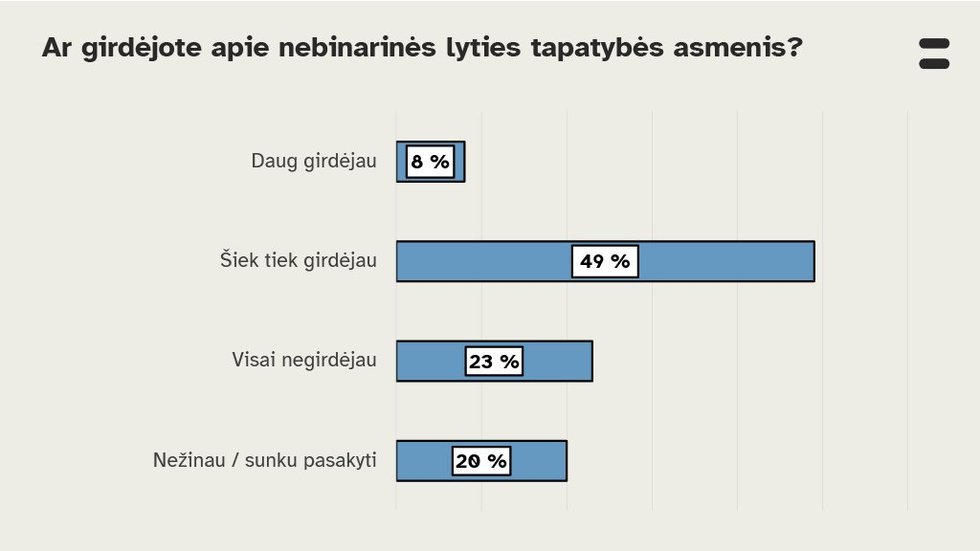 Tuo tarpu, šiemet tarnybos atlikta apklausa apie translyčius asmenisi parodė, kad 43 proc. Lietuvos gyventojų arba nėra girdėję apie nebinarinės lyties tapatybės asmenis, arba nežinojo, ką atsakyti.