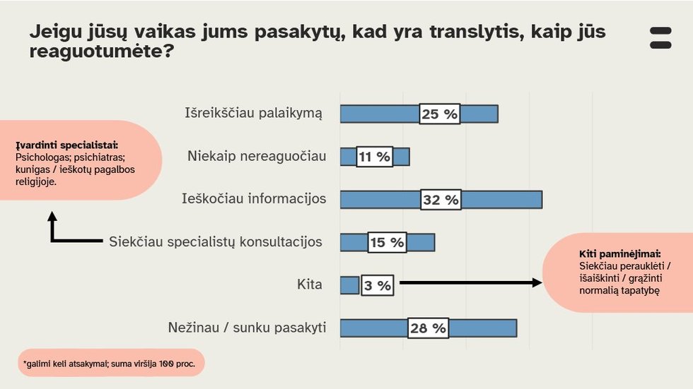 Apklausos duomenys taip pat atskleidė, kad tik kas ketvirtas Lietuvoje išreikštų palaikymą savo vaikui, jei vaikas pasakytų, kad yra translytis.