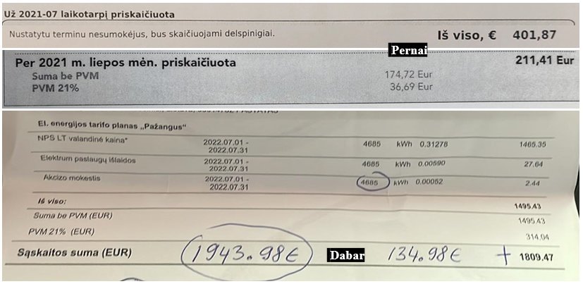 Tačiau liepos mėnesio sąskaita buvo paskutinis lašas. Pernai moteris mokėjo 613,28 euro, o dabar liepos mėnesio elektra jai atsiėjo beveik 2 tūkst. eurų – 1943,98 euro, t. y. 41 centas už 1 kW: „Gegužę dar mokėjau 700 eurų. Matote, koks skirtumas?“