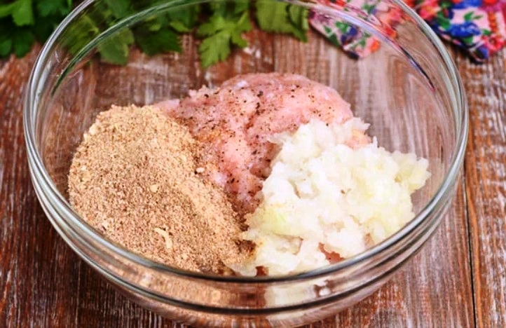 Smulkiai supjaustykite svogūną smulkia tarka ir suberkite jį į maltą mėsą kartu su džiūvėsėliais. Šiam receptui rekomenduojame naudoti naminę maltą vištieną.