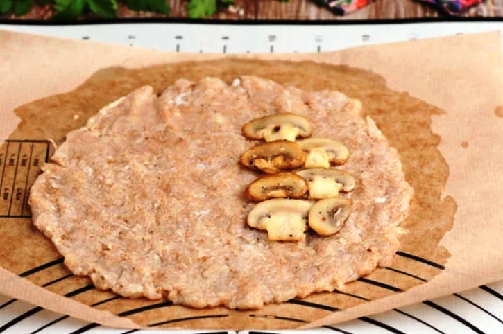 Kepimo popierių ištepkite augaliniu aliejumi ir ant jo dėkite maltos mėsos rutuliuką. Rankomis suformuokite ploną, apvalią paplotėlį. Ant viršaus uždėkite keletą keptų pievagrybių griežinėlių.