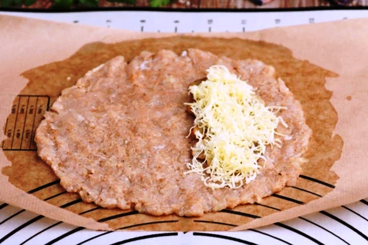 Smulkiai sutarkuokite sūrį ir pabarstykite juo grybus. Įdarą uždenkite kepimo popieriumi, kuriame yra likusi malta mėsa. Iš likusių maltos mėsos kukulių tokiu pačiu būdu suformuokite mėsos čeburekus.