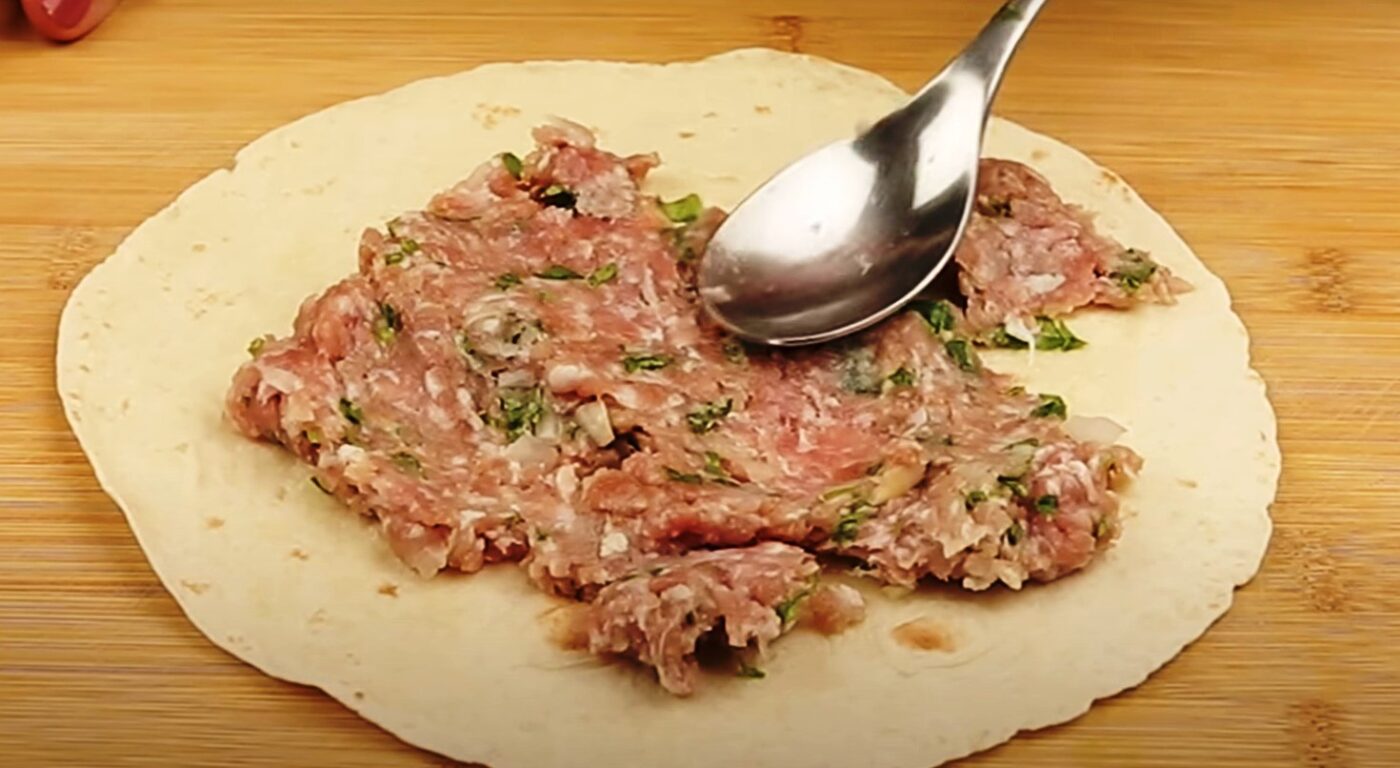 Lavasha lapai sutepami malta mėsa ir nuvalomi nuo ritinio.