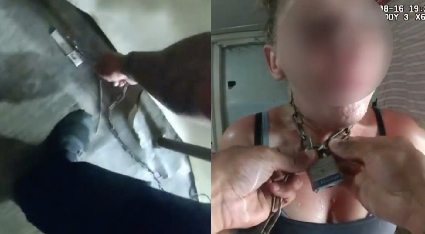 Vaizdo įraše, kuriuo pasidalijo moterį radę pareigūnai, matyti, kad juos išvydusi, ji atrodė labai susikrimtusi, o aplink jos kaklą buvo apvyta stora grandinė, kurios kitas galas varžtais buvo prisuktas prie grindų.