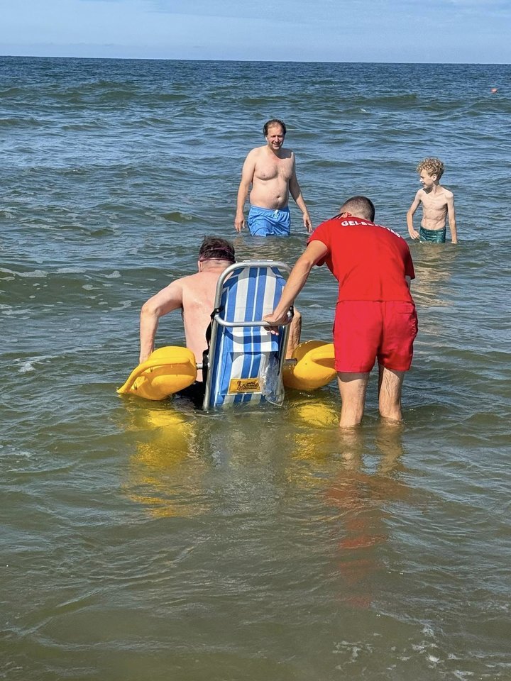 „Džiaugiamės galėdami prisidėti prie svajonės – poilsiautojas pirmą kartą išsimaudė jūroje!! Šis maudymosi vežimėlis – tai pagalbinė priemonė judėjimo negalią turintiems žmonėms. Su šiuo vežimėliu lydimi asistento neįgalieji gali saugiai maudytis jūroje.