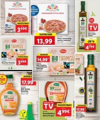 Pavyzdžiui, pica Lietuvoje kainuoja 3,49 euro, o Lenkijoje 13,99 zlotų, t. y. 2,88 euro. Tiramisu Lietuvoje kainuoja 3,99 euro, o Lenkijoje 14,99 zlotų, t.y. 3,09 euro, alyvuogių aliejus Lietuvoje kainuoja 4,79 euro, o Lenkijoje 17,99 zlotų, t. y. 3,71 euro, klevų sirupą Lietuvoje galima nusipirkti už 4,99 euro, o Lenkijoje už 17,99 zlotų, t. y. 3,71 euro.