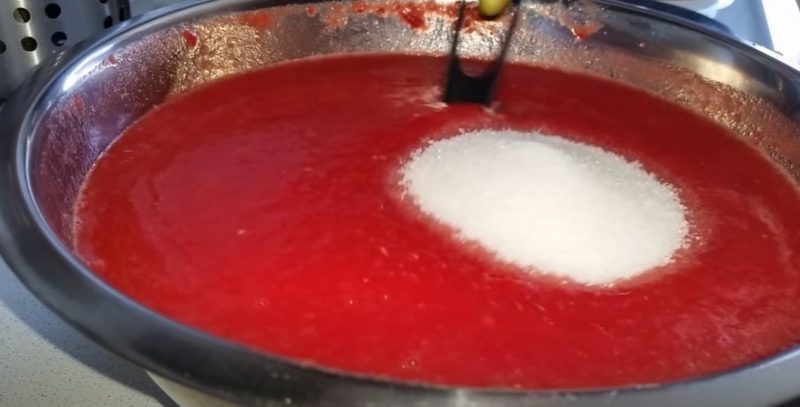 Pomidorų sultys virti su druska ir cukrumi, kad virtų, sumažinti ugnį ir virti 10 minučių.