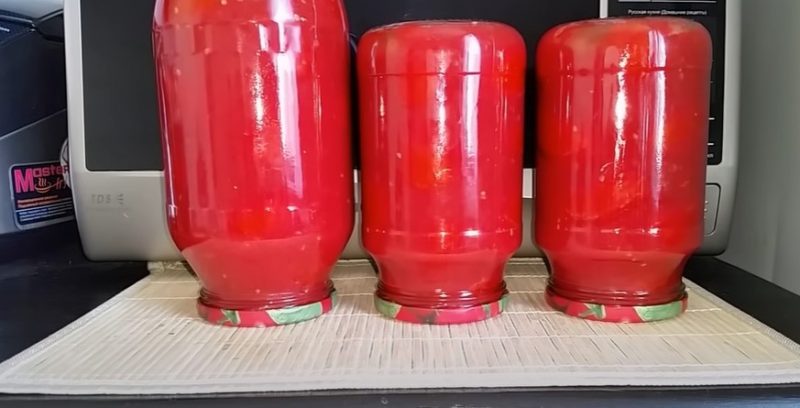Supilkite verdančias pomidorų sultis į skardines, pasukite dangtelius, apverskite ir nustokite vėsinti.