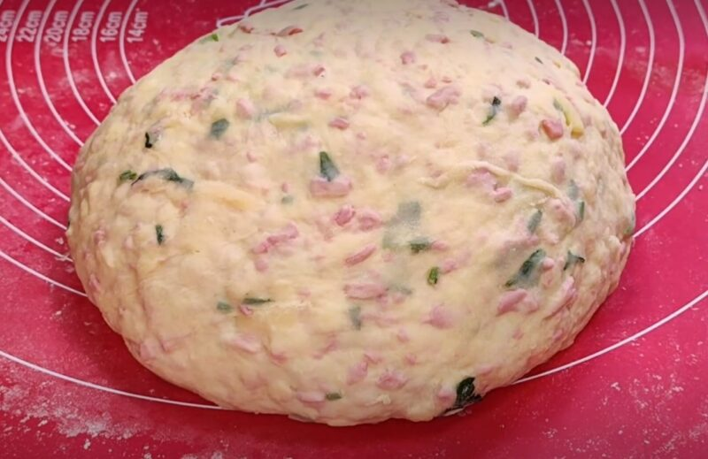 Į bendrą masę suberkite miltus ir kepimo miltelius ir minkykite iki vientisos tešlos. Pabarstykite stalo paviršių miltais ir minkykite tešlą rankomis.