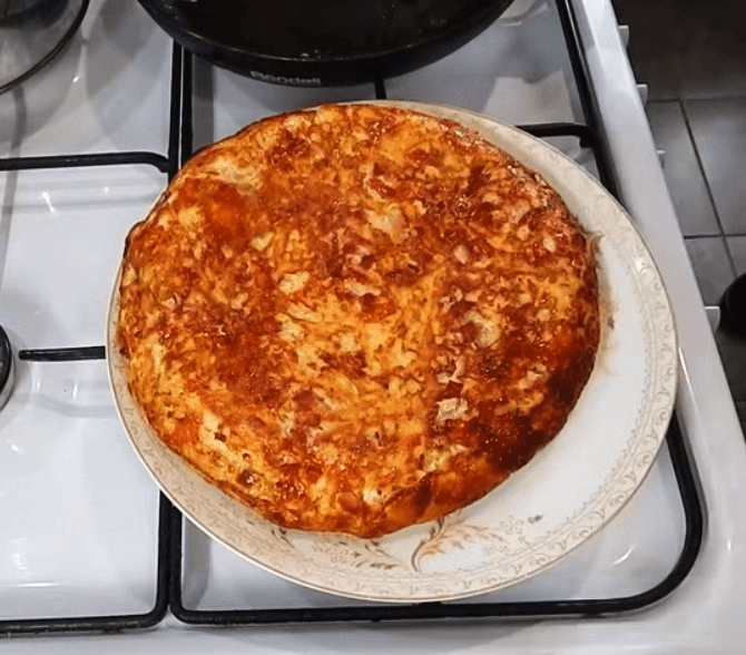 Visą masę dedame į keptuvę, uždengiame dangčiu, kepame ant silpnos ugnies 15 min., tada apverčiame ir kepame 7 – 10 minučių iki auksinės rudos spalvos.