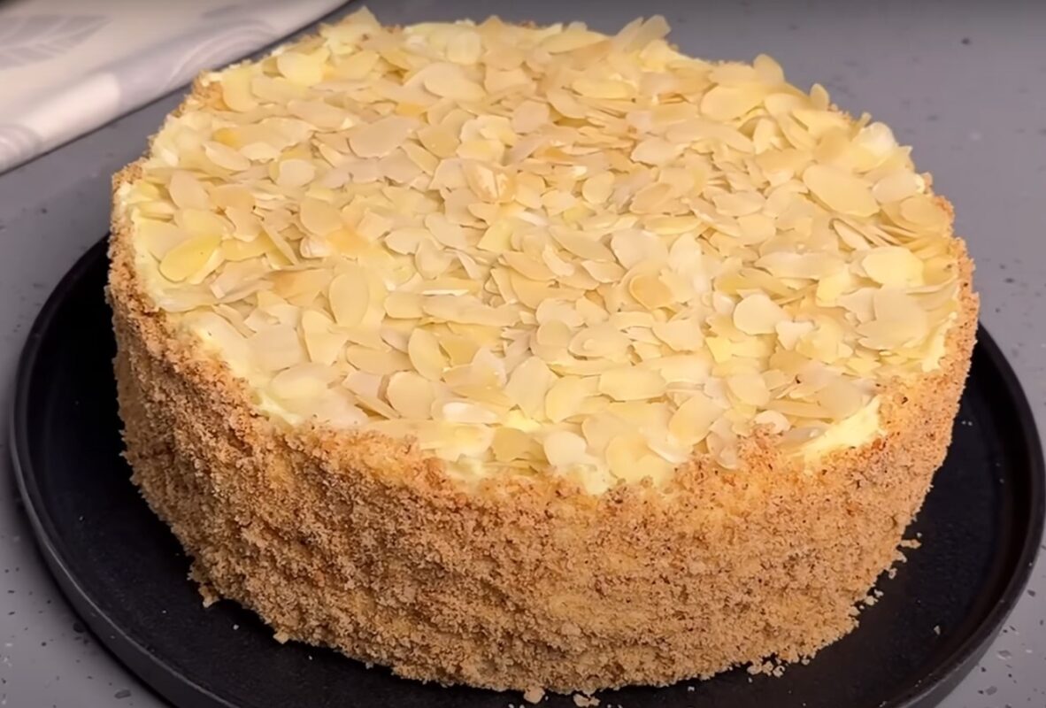 Papuoškite tortą migdolų žiedlapiais ir sausainių trupiniais.