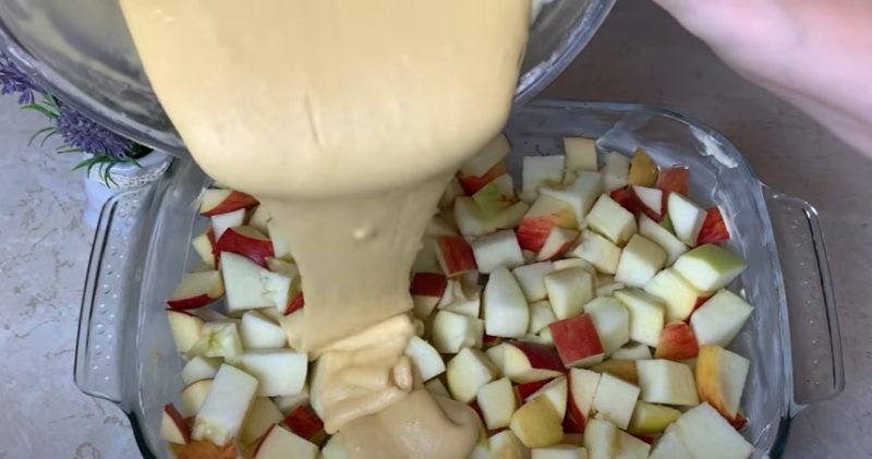 Kepimo forma yra sutepta sviestu, išdėstyti obuolius ir supilti juos su bandymu, išlyginti.