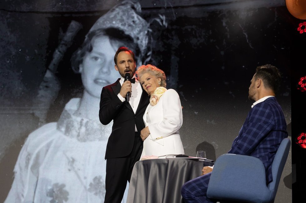 Elegantiškas, dizainerio Juozo Statkevičiaus siūtas baltas kostiumas, tviskantys papuošalai, ryškios lūpos ir iš veido nenykstanti šypsena – tokią aktorę rugsėjo 6-ąją pamatys ir Lietuvos televizijos žiūrovai.