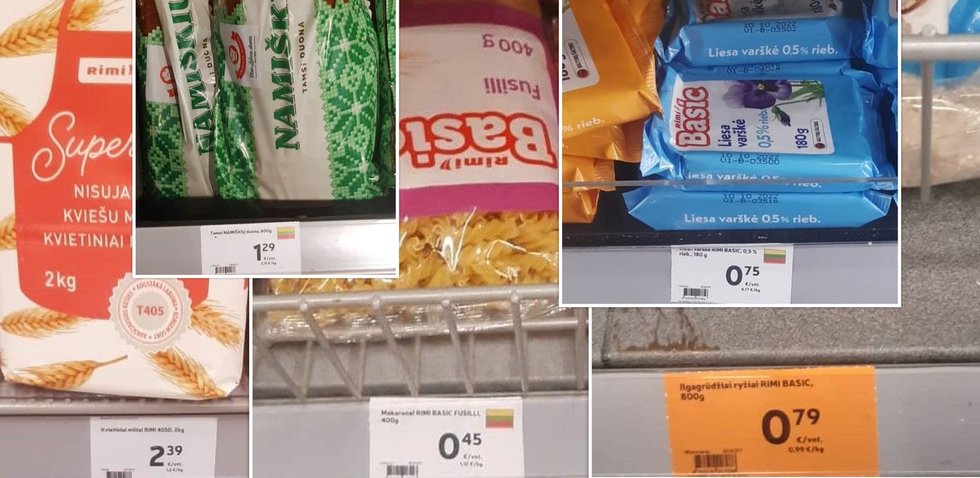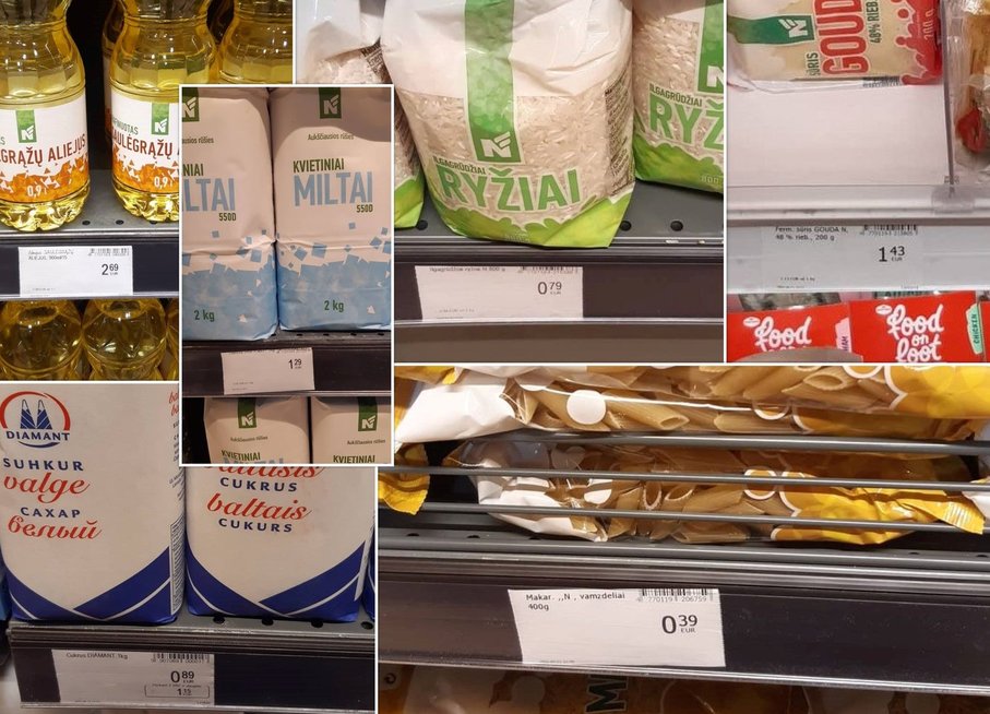 Toliau kainas patikrinau prekybos tinkle „Norfa“. Čia 800 g ryžių kainavo 0,79 euro, olandiško sūrio 200 g – 1,43 euro, 180 g sviesto – 1,49 euro, 180 g varškės – 0,61 euro, O,9 l pieno – 0,63 euro, 2 kg kvietinių miltų 1,29 euro, 400 g. makaronų – 0,39 euro, 1 kg cukraus – 0,89 euro, 1 l saulėgrąžų aliejaus 2,69 euro, 700 g duonos – 0,65 euro.