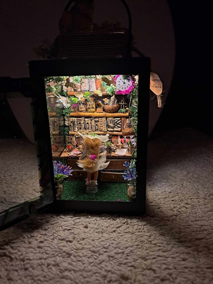 Šalia stovėjo žibintas – tuščias, jame buvo žvakutė. Pagalvojau: „Nors sulysk į tą žibintą ir užsidaryk nuo visų ligų, skausmo ir nevilties.“ Su ta mintimi pradėjau sukioti žibintą, ieškoti visokių savo nereikalingų papuošalų, pasiėmiau samanas, kurias auginau, augalus, kurie nuvyto ir sudžiūvo. Taip sukūriau savo pirmąjį namuką.