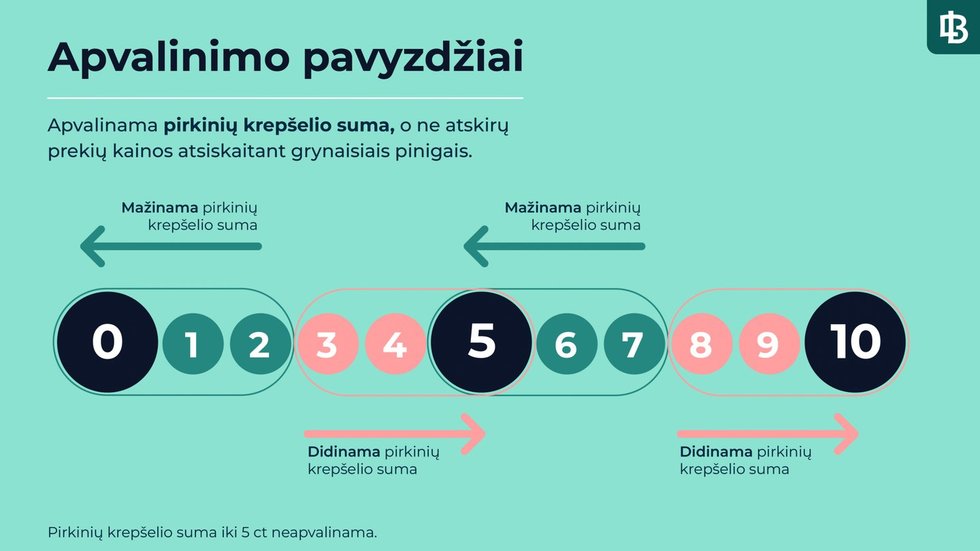 Atsiskaitymo metu sumos bus apvalinamos tokiu būdu: jei galutinė suma baigiasi 1 centu arba 2 centais, ji apvalinama žemyn iki 0 centų, jei baigiasi 3 arba 4 centais – aukštyn iki 5 centų.