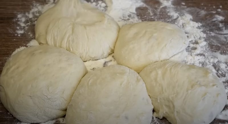 Stalas apibarstomas miltais ir išdėlioja tešlą, kompetentą ir suskirstomas į porcijų gabalėlius, suvyniotas kolas, uždenkite plėvele ir palikite 20 minučių.
