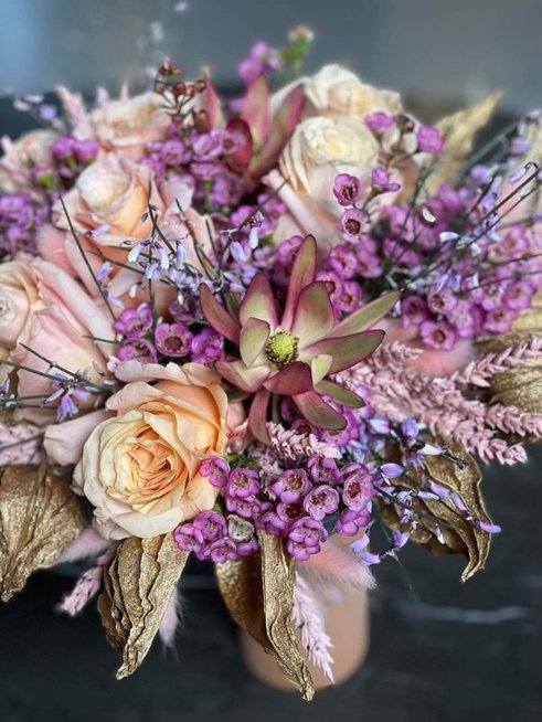 Galutinis rezultatas tikrai nustebins žiūrovus – bijūninės rožės, ginstera, leukadendronas ir vaškagėlė susijungs į prabanga alsuojančią puokštę.
