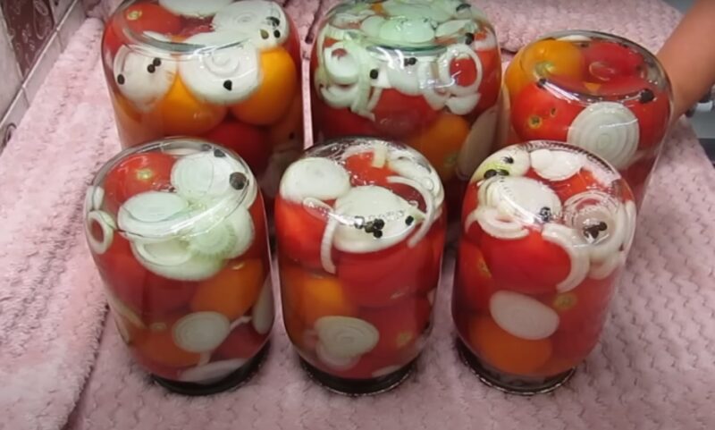 Prieš tai užvirinkite vandenį dideliame puode. Pomidorus sudėkite į stiklainius, pakaitomis juos dėdami su svogūnų žiedais. Į stiklainius įpilkite verdančio vandens.