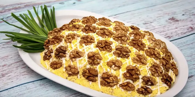 Pradėkime ruošti salotas. Pirmiausia ant ovalo formos lėkštės sudėkite keptus grybus, tada vištienos filė. Palaipsniui formuokite salotas į ananaso formą. Kitas sluoksnis – ananaso gabalėliai. Sūrio ir kiaušinio mišinys, sumaišytas su majonezu, padengia visas salotas, įskaitant šonus. Majonezo tinklelis ir riešutų puselės viršuje primena ananaso žvynus, o laiškiniai svogūnai simbolizuoja vaisiaus kotelį.