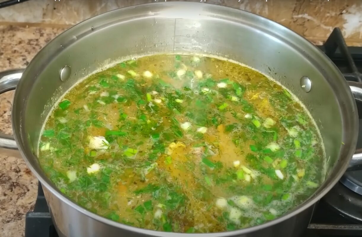 Sriubą dar 2-3 minutes virkite po dangčiu, pagal skonį įberkite žolelių.