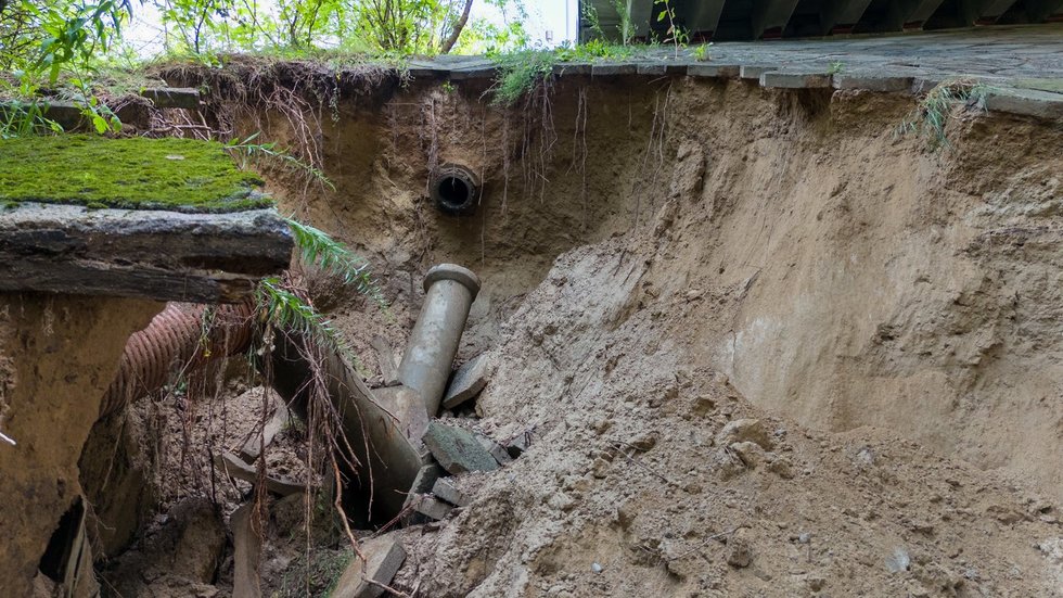 Socialiniuose tinkluose plinta vaizdo įrašai, kuriuose matyti, kaip smarki liūtis išplovė šlaitą po Raudondvario plente esančiu tiltu, praneša portalas kaunas.kasvyksta.lt.