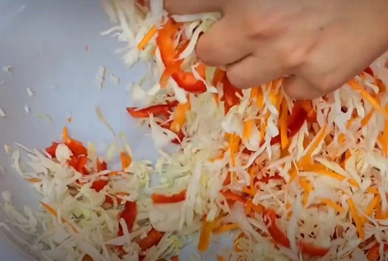 Smulkiai supjaustykite kopūstą, o papriką supjaustykite mažais kubeliais. Morkas sutarkuokite ir sudėkite į kopūstą kartu su paprikomis.