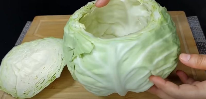 Mes atsargiai supjaustome vidurį, kad tankus „pulinas” pasirodytų iš galvos, kuriame mes uždėsime kopūstus.