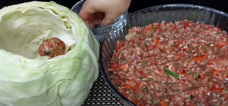 Mes suformuojame mažus kukulius ir įdedame juos į mėsos kopūstų galvą.