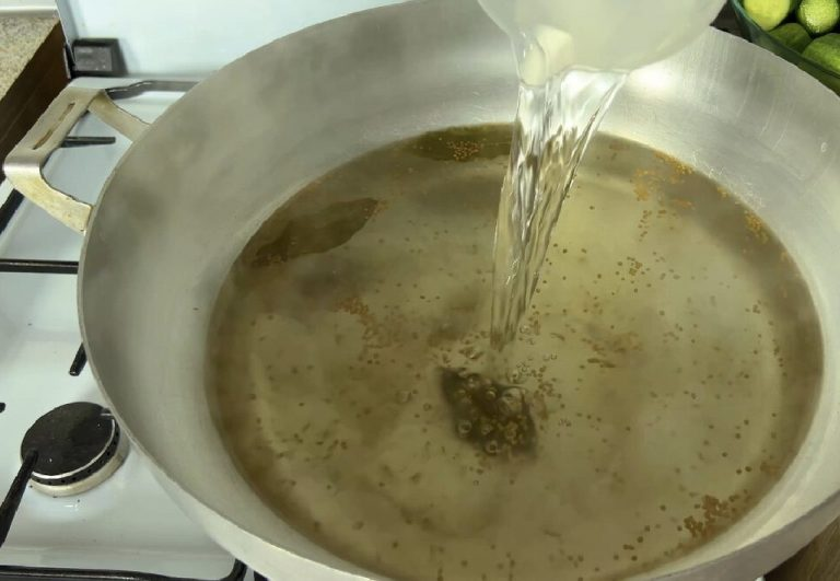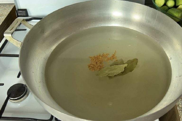 Paimu didelį dubenį, pastatau jį ant viryklės ir užpilu trimis litrais vandens. Įdedu šešis šaukštus rupios akmens druskos, 400 gramų cukraus, du arbatinius šaukštelius garstyčių sėklų ir tris lauro lapus.