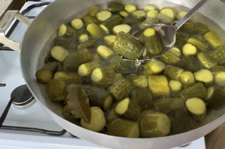 Kai tik agurkai pasidaro balti, juos dar paverdu tris minutes ir nuimu nuo ugnies.