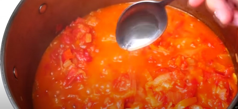 Sumaišykite pomidorų ir saldžiųjų pipirų gabalėlius, įpilkite druskos ir cukraus, česnako, užvirkite ir virkite 2 minutes. Injekcija su actu ir kepama pusę minutės.
